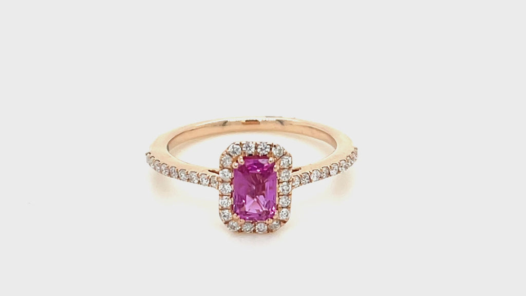 Anillo con halo de diamantes y zafiros rosa esmeralda de 0,90 quilates en oro rosado de 18 k