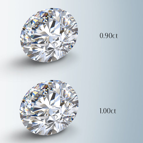 For example, you should expect to pay less, per carat, for a diamond weighing 0.90 carats than for a 1.00 carat diamond. It is almost impossible to see the difference between the two.
