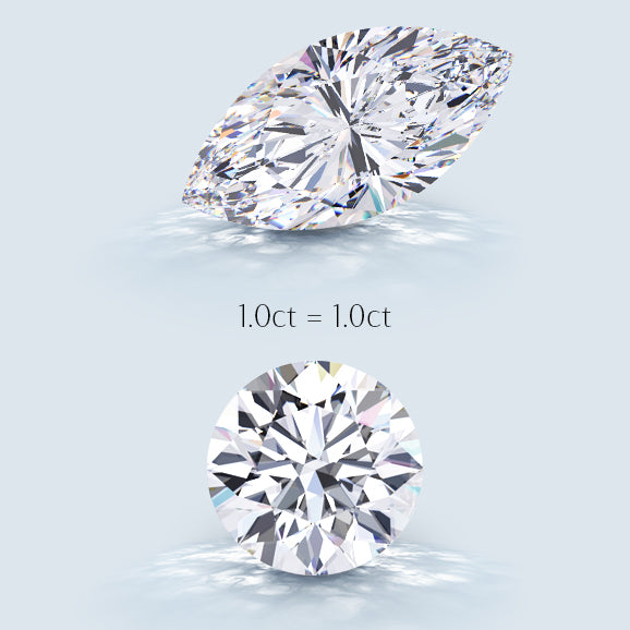 To give an idea of how the shape of the marquise affects its perceived size, as compared to a round cut ring; a 1 carat round cut diamond will have a diameter of approximately 6.4mm. The marquise will measure about 10.5mm long and 5mm wide. People will notice the length and be hugely impressed while not seeing the slightly smaller width!