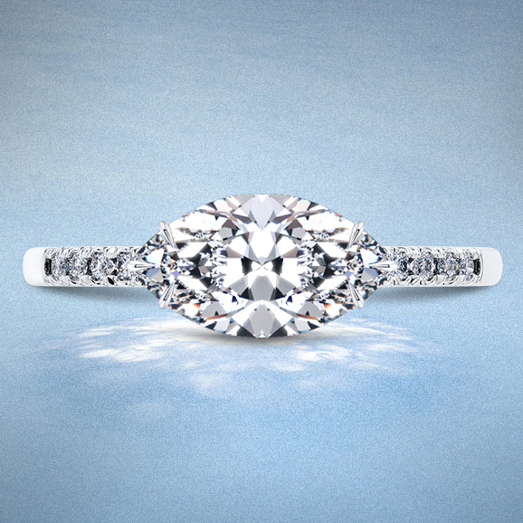 East-West is not an official name for a setting but rather a way of aligning the diamond. Typically, a marquise cut diamond is aligned along the length of the finger, but setting the stone across the fingers creates a big visual impact. This effect works best with larger diamonds of 2 carats or higher, which will be wider than the width of the finger. With a smaller diamond, the width of the marquise will be less than the width of the ring’s band losing the effect. With smaller gems, vertical alignment is best.