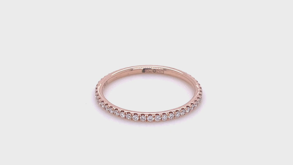This full eternity ring has been gorgeously crafted out of warm 18k rose gold and is claw set showcasing 0.30 carats of brilliant-cut and ethically sourced G/SI quality diamonds, giving the ring a flawless finish. This elegant rose gold eternity ring features fifty sparkling diamonds firmly placed around the 18k rose gold band in a claw setting for a sparkling effect.