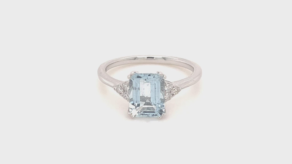 This stunning ring is ideal for a lady celebrating her birthday in March. The sky blue emerald-cut aquamarine stands proudly at the centre of the ring. The aquamarine is surrounded by sparkling melee diamonds that set off the aquamarine's brilliant colour. The aquamarine weighs 1.37 carats, the G/SI quality diamonds weigh 0.08 carats, and the ring's band is made from lustrous white platinum with a British hallmark.