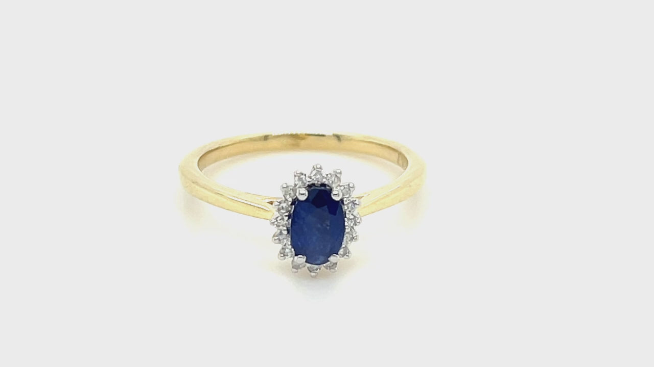 The 9k yellow gold is used to create this gorgeous ring. It makes a wonderful gift for any event. The ring, which has a lovely oval cut blue sapphire weighing 0.60 carats, is a wonderful way to highlight the blue sapphire's beauty. It is the ideal complement to any collection because to its magnificent centre stone and distinctive diamond halo design. The ring has 0.10ct of G/SI quality diamonds. When you wear this lovely ring, you will stand out.