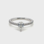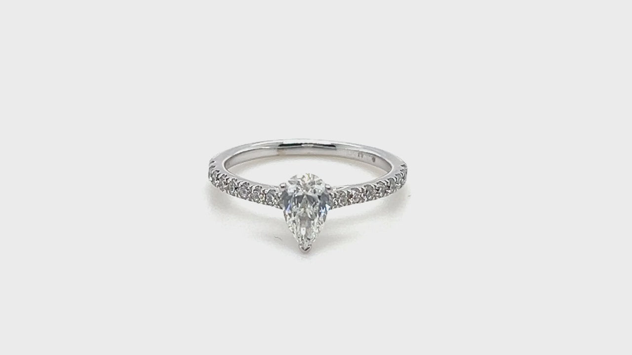 A ring to cherish forever, this pear-cut diamond engagement ring is the epitome of elegance. With 0.80 carats of dazzling G/SI quality diamonds, including the side stones on the band, this ring is a breathtaking representation of your everlasting love. The band is handcrafted from pure platinum and comes with a lifetime workmanship guarantee, ensuring this ring will symbolise your love for years to come. Plus, the main diamond comes with an independent diamond grading report.
