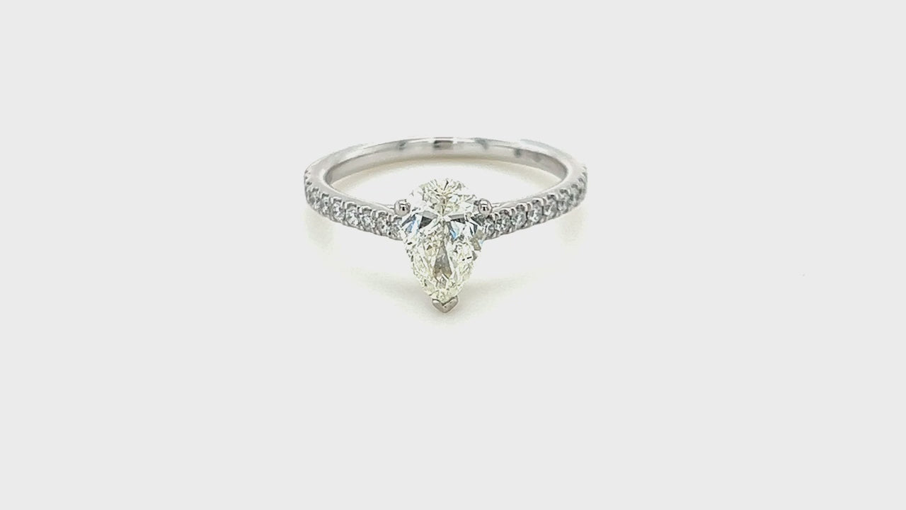 This radiant pear-shaped diamond engagement ring perfectly represents your love and devotion. The centre diamond is a pear-cut E/VS quality diamond with sparkling side stones along the band, adding an extra touch of sparkle and elegance. At 1.20 carats total diamond weight, this ring will make a lasting impression. The band is handcrafted from pure platinum, and a lifetime workmanship guarantee backs the entire ring. An independent diamond certificate is offered for the main stone.