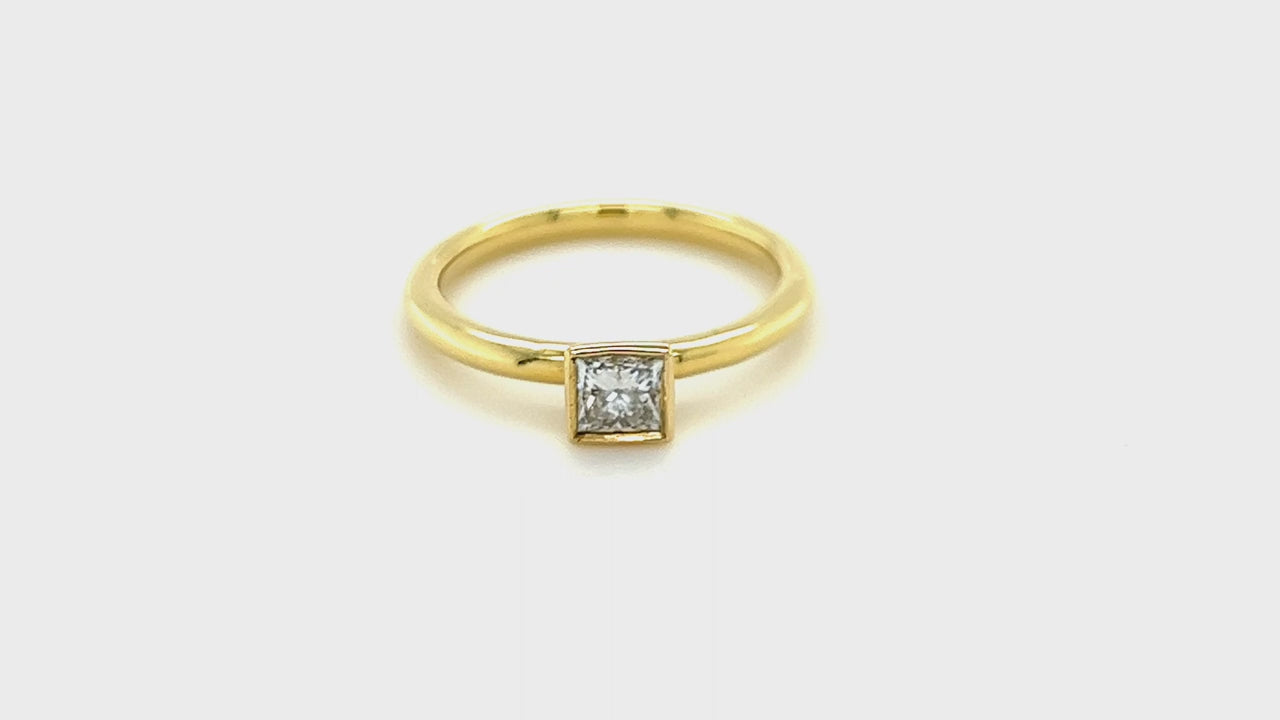 This exquisite princess diamond solitaire engagement ring is the perfect way to ask for her hand in marriage. The 0.30ct princess-cut diamond is securely set in a beautiful, sophisticated rub-over setting. The G/SI quality diamond guarantees that this ring has a beautiful, brilliant look, while the 18k yellow gold band, hallmarked in the UK, assures the quality of the precious metal. Sold with a lifetime workmanship guarantee and an independent diamond certificate.