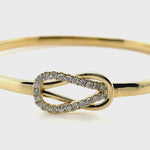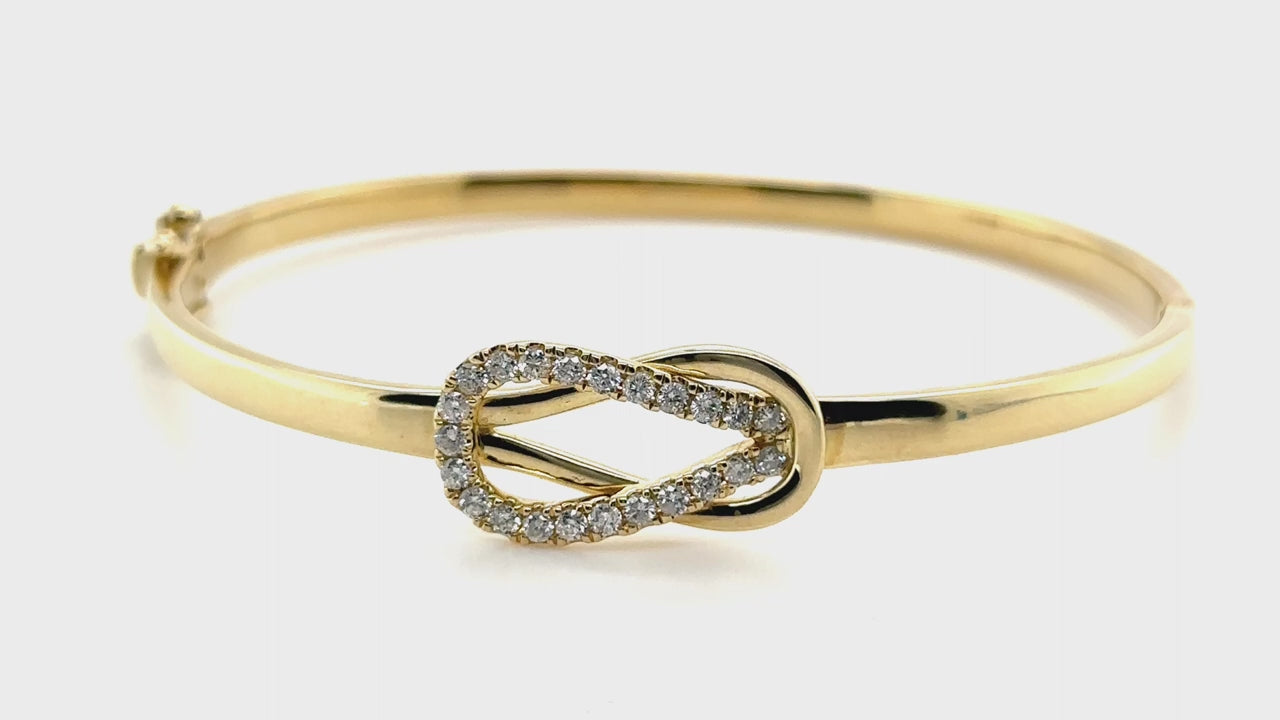 This diamond bangle has a lovely looped design forming the backdrop to the diamond accent. The diamonds are all of G/SI quality, weighing a total of 0.55 carats. The bangle is crafted using UK hallmarked 9k gold. This is a delightful piece of diamond jewellery that can be confidently worn either as ‘best’ or every day. The bangle is designed and handcrafted here in the UK and is offered with our lifetime workmanship guarantee.