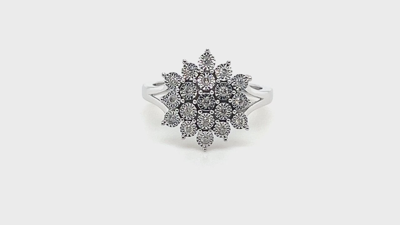 She will love this diamond cluster ring with its floral design when she slips it on her finger! The ring’s head will look impressive on her finger with its 15.0mm diameter. The ring has a total of 0.20 carats of G/SI quality diamonds in illusion settings that give the visual impression of as much as 3.00 carats! The ring is handcrafted in UK hallmarked 9k white gold. This ring can be confidently worn every day and on every occasion.
