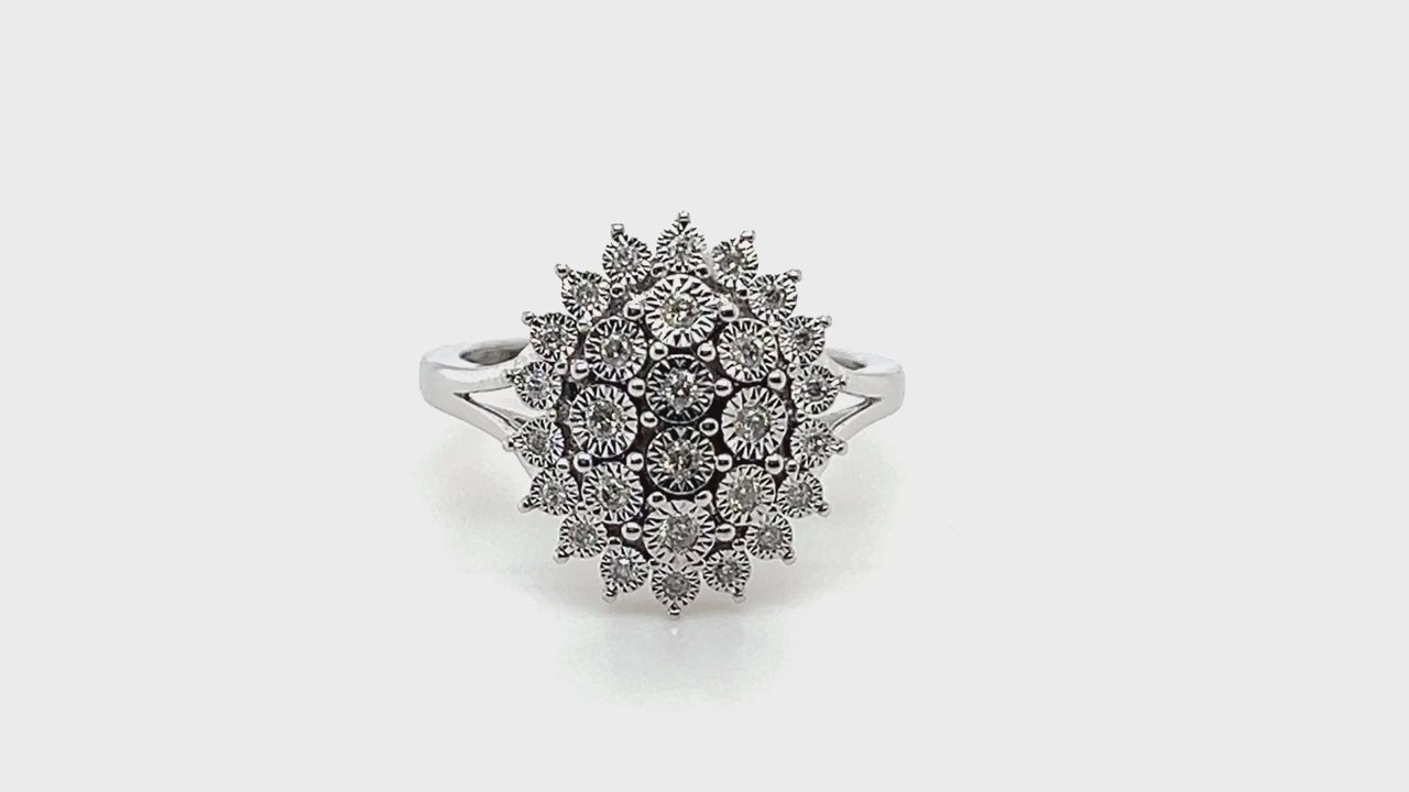 This British handcrafted ring is an excellent choice if you want an impressive piece of diamond jewellery at a reasonable price. This diamond cluster ring has an oval shape formed from a total of 0.20 carats of g/si quality diamonds. Each diamond is placed in an illusion setting that gives the visual effect of a single much larger diamond. The ring is made with 9k white gold with a British hallmark. We back our artisan’s craftsmanship with a lifetime workmanship guarantee.