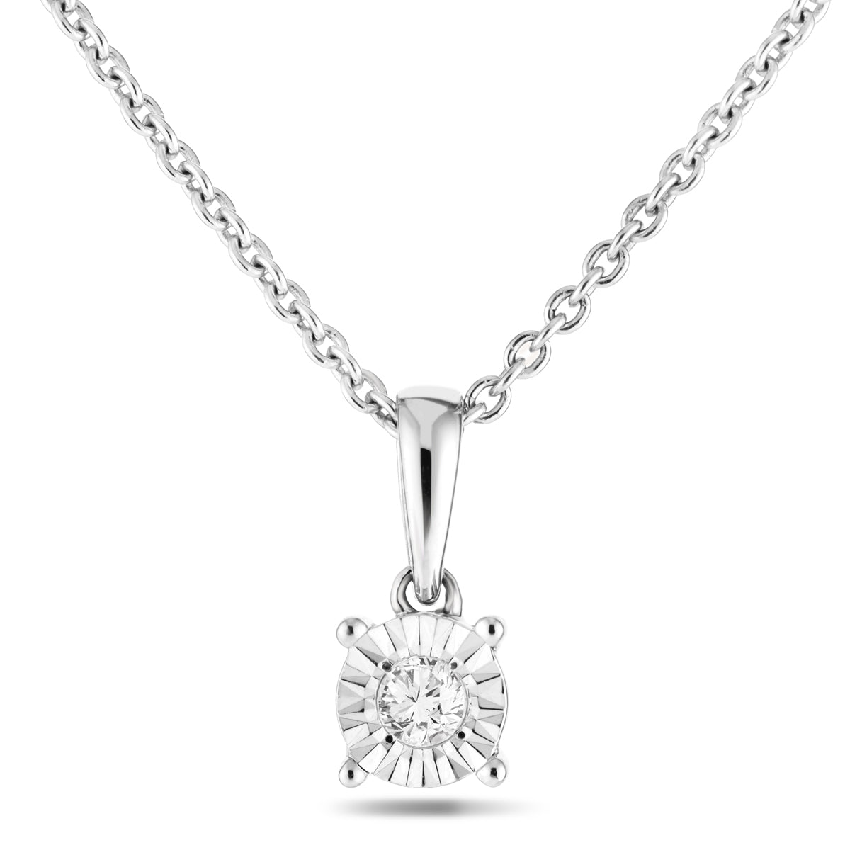 Here is a diamond solitaire pendant necklace with an illusion setting that makes the 0.06 carat, G/SI quality diamond look like a larger diamond. The illusion setting is made from UK hallmarked 9k white gold. This piece is designed and handcrafted in the United Kingdom and is offered with a lifetime workmanship guarantee. If you are looking for an impressive piece of diamond jewellery at a great price, this is an ideal choice!