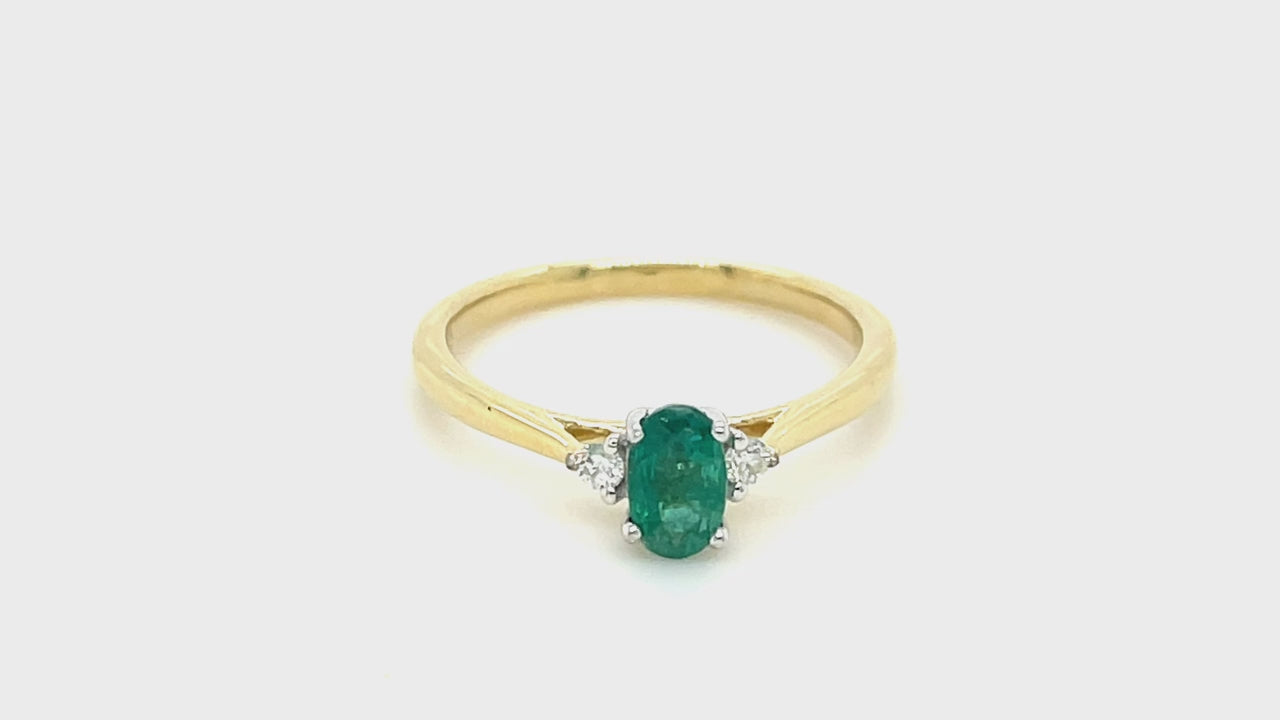 This 9k gold ring is stunning in its simplicity and sophistication. In the centre of this ring is a stunning 0.50 carat green emerald, and on either side are two brilliant round diamonds that have a combined weight of 0.06 carats. The quality of the diamonds is G/SI. To stand out against the 9 karat yellow gold ring, the setting has been rhodium plated. This ring looks great stacked or on its alone. Our lifetime guarantee on craftsmanship is included in the asking price.