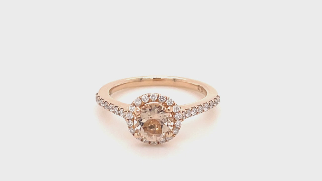 This beautiful morganite and diamond ring is set with a beautiful brown morganite gemstone weighing 0.77 carat. The centre stone is a brilliant round cut to catch the light. 0.28 carats of brilliant round diamonds weighing have been set in a halo around the morganite and running along the shanks of the rose gold band. The 9k rose gold makes a perfect backdrop to the brown of the centre stone. We are proud to offer this fine jewellery with a lifetime workmanship guarantee.