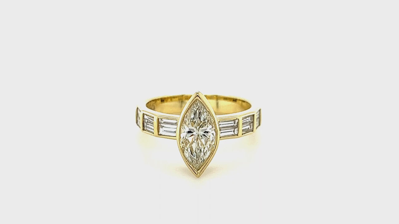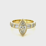 Capture the essence of your love story with this exquisite marquise shape diamond engagement ring. The main diamond is a marquise-cut gemstone that shines with unmatched brilliance. The 18k yellow gold band is handcrafted to perfection, with baguette cut diamond accents that add a touch of glamour. The total diamond weight is 1.60ct; each diamond is of E/VS quality. This ring symbolises love, and our lifetime workmanship guarantee ensures it will be cherished for a lifetime.