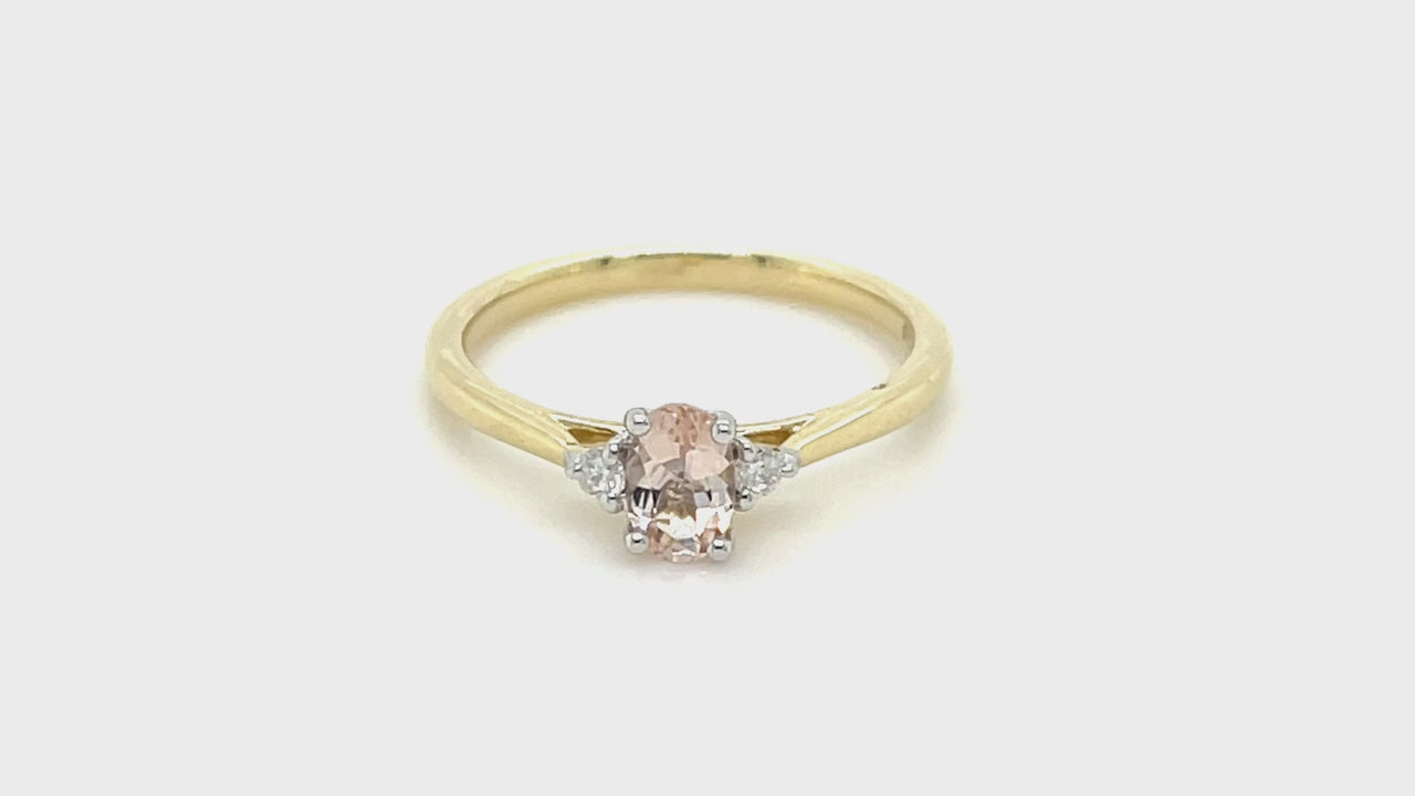 This beautiful ring has a high level of sophistication. The wearer of this ring will always be the object of jealous gazes. The 0.40 carat oval-cut morganite set in 9k yellow gold was hand-selected by our in-house design team. To complement the morganite, two white diamonds of G/SI quality totalling 0.06 carats are claw-set into the top of the gold ring on either side of the stone. This is a ring to treasure and enjoy wearing for a lifetime!