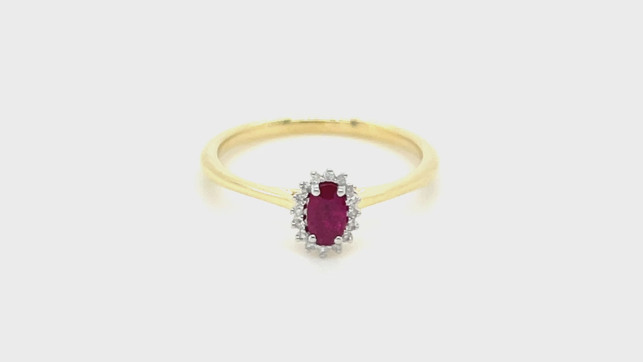 This ruby and diamond halo ring will be a lovely addition to anyone’s jewellery collection. The central ruby weighs 0.30 carats and is enhanced with 0.05 carats of natural, G/SI quality diamonds set in an entrancing halo around the central gemstone. The ruby and diamonds are set atop a classically elegant 9K yellow gold band with a UK hallmark of the quality of the precious metal. We offer this gorgeous ring with our lifetime workmanship guarantee.