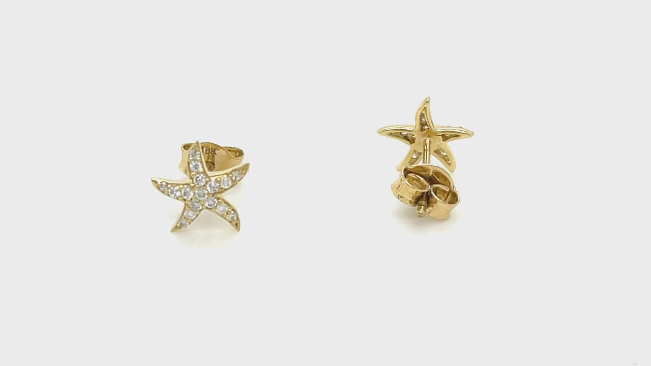 This pair of starfish diamond earrings are simply gorgeous. This elegant pair of earrings will complement any ensemble with which you care to match them because they are versatile and subtle. These earrings are handcrafted in brilliant 18k yellow gold. The starfish design is traced out with 0.18ct of pave set G/SI quality diamonds. We are sure this striking pair of earrings will become a staple of your collection.