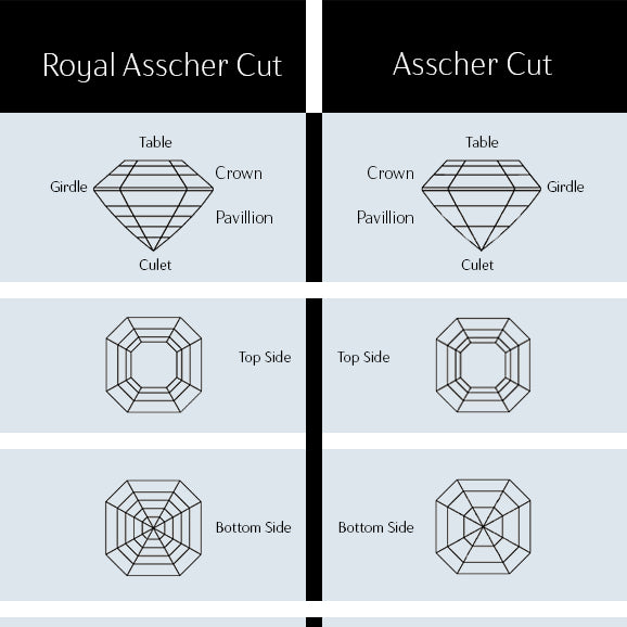 While they are similar to emerald cut gems, with 58 facets; asscher cut diamonds feature a smaller table (the flat top facet) and overall depth. These proportions give asscher cut diamonds more sparkle and brilliance than emerald cut gems.