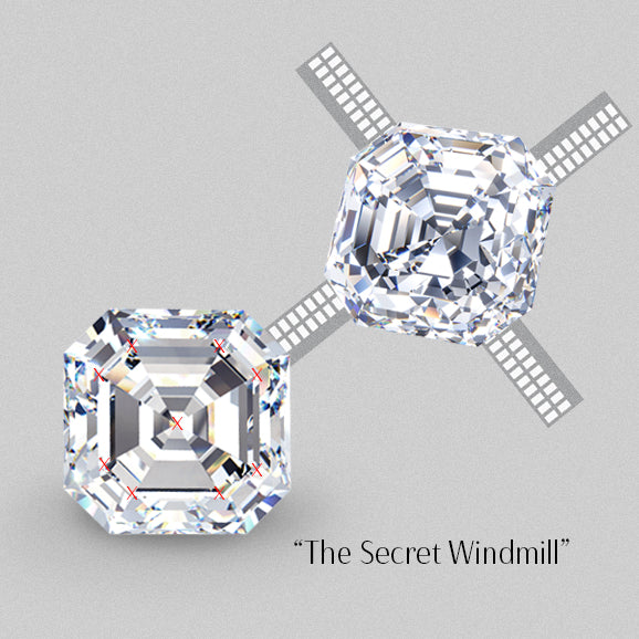 A well-cut asscher diamond will exhibit a characteristic windmill effect running from the corners of the stone to the centre. Many asscher shape diamonds are not cut well enough to show this effect.