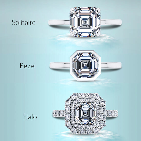 If there is one setting style to avoid when choosing a ring with an asscher cut diamond, it is the bezel setting. The metal all around the diamond is not required as protection and only serves to make the diamond look less bright. The bezel gives a boxed in appearance that makes the gem look less brilliant and smaller.