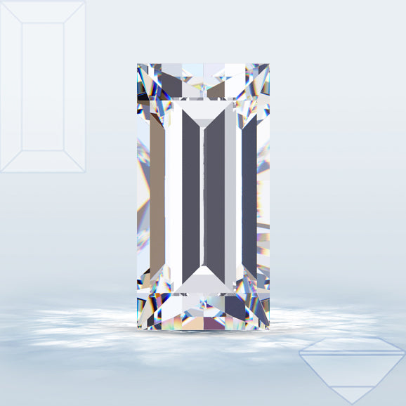Baguettes are usually cut with 24 facets and are much less brilliant than round diamonds. As a result of the lesser brilliance, they tend to show off colour more than many other diamond shapes so care should be taken when choosing the colour grade. Baguettes have excellent clarity due to their large table facet (the large flat top facet).