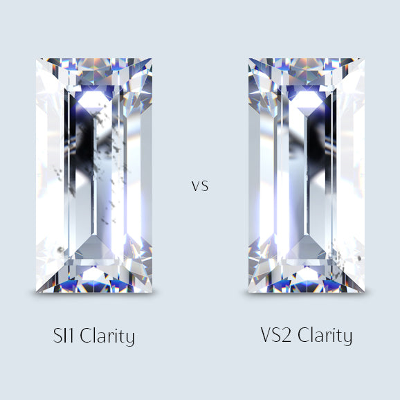 Baguettes are pleasing for their straight lines and simplicity, but this simplicity, which extends to the low number facets makes them very sensitive to clarity. Even the smallest flaws, such as black carbon crystals or feathering, will be immediately apparent. Choosing a clarity grade of VS2 or better is an essential choice. Even when a high clarity grade is selected, careful inspection is needed to ensure that any flaws present are not easily visible.
