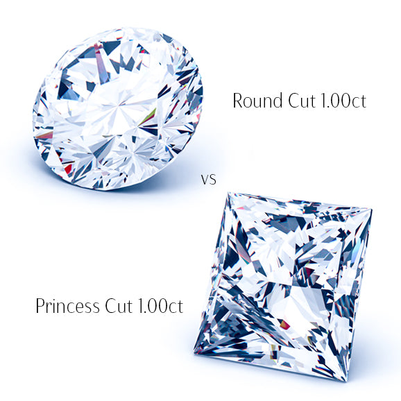 Princess cut diamonds look larger than round cut diamonds of the same weight, especially when they are mounted into a ring. The looks are an optical illusion!