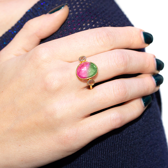 This is an unusual stone with a green layer separated from red by a layer of clear stone. This gives the appearance of a watermelon, hence the name. Cutting the gems to maximise the effect is a skilled craft. The best examples of watermelon tourmaline have a 50/50 blend of green and red.