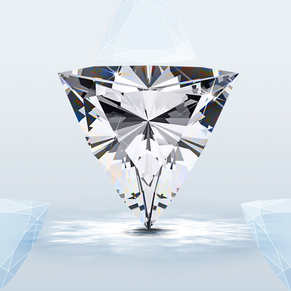 Trillian shape diamonds have a shallower depth than most other cuts, typically around 35-45%. This means that the diamond is cut wider, carat for carat than other shapes, giving a perceived larger sized gem. There is a trade-off here, the fire and brilliance of the cut diamond are dependent upon the depth so a wider, shallower stone will have reduced brilliance and fire.