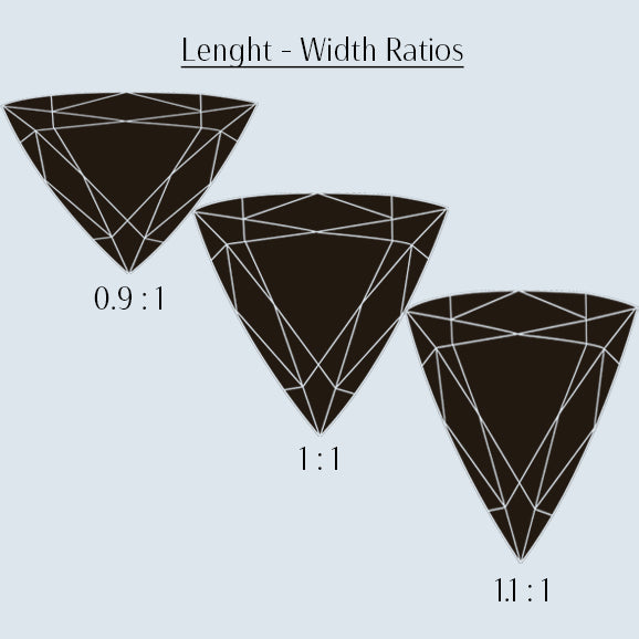 The triangular shape needs to be cut with proper proportions to look pleasant to the eye. The need for good shape means choosing a stone with all three sides of equal length, a 1:1:1 ratio. Some pieces of jewellery can support a slightly longer or broader stone but rings, in particular, need to be well-proportioned.