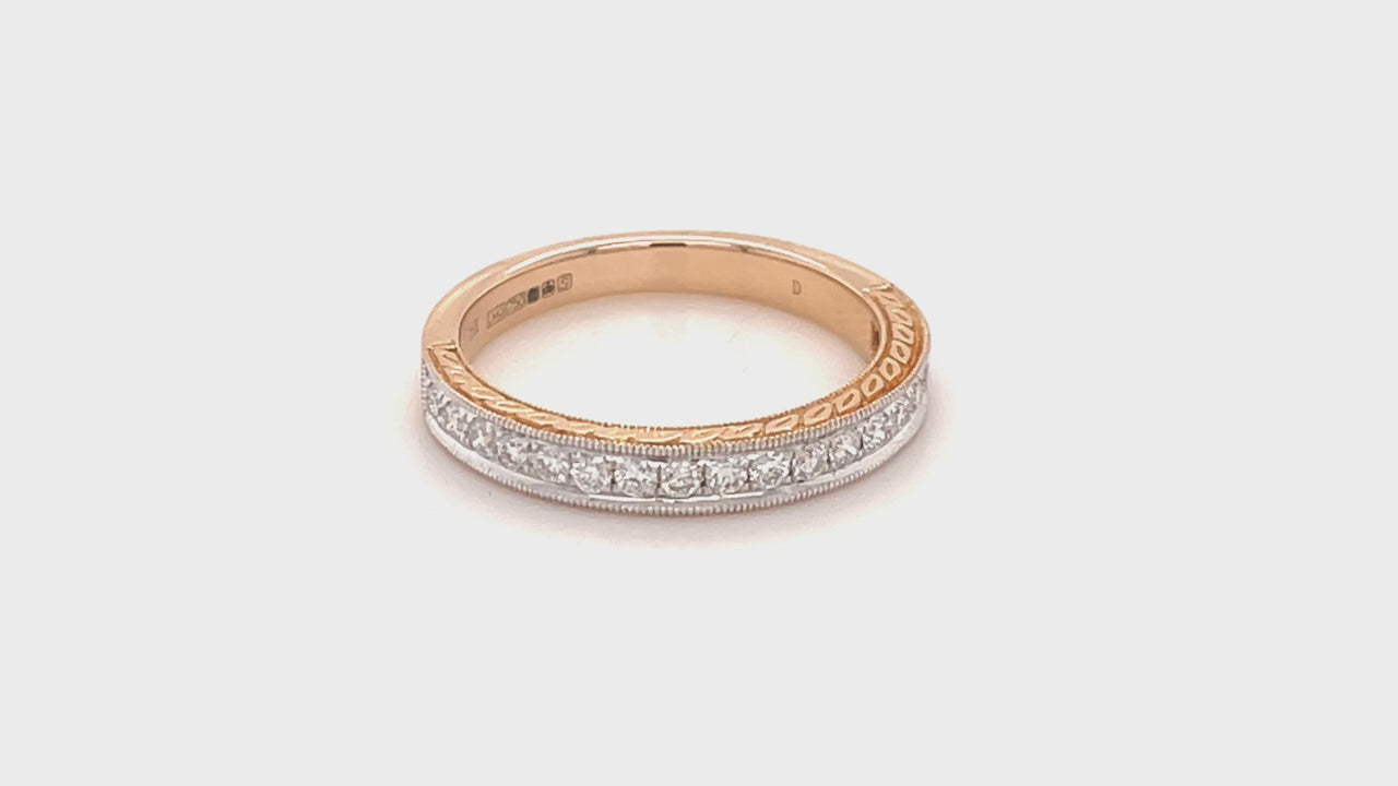 Comparta con encanto sus sentimientos de afecto con esta hermosa pieza. Dieciocho piedras talladas a mano de diamantes de calidad G/SI de origen ético colocadas en una montura de canal clásica incrustadas en cálido oro rosado de 18k. Este clásico anillo de media eternidad es una llamativa y romántica muestra de amor que durará toda la vida, garantizado.