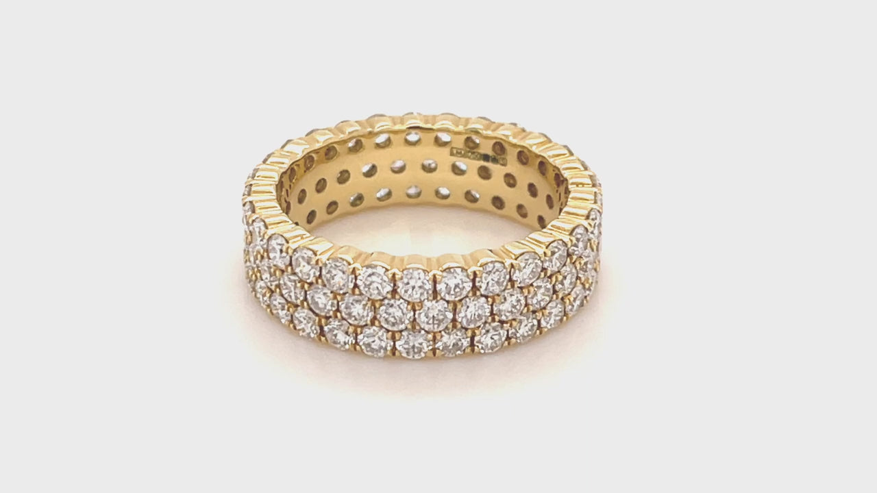 Este es un sofisticado y elegante anillo de eternidad completa de tres filas, con ochenta y siete diamantes redondos de calidad G/SI en engaste en punta con un peso de 3,00 quilates. Los diamantes están engastados en una banda de oro amarillo de 18k en un patrón distintivo de 3 hileras. El anillo presenta diamantes de origen ético que se colocan cuidadosamente en monturas de garras alrededor de la banda. Es una declaración de amor y gusto clásica y, sin embargo, muy moderna. Vendido con la garantía de confianza de por vida del trabajo de nuestros artesanos del Reino Unido.