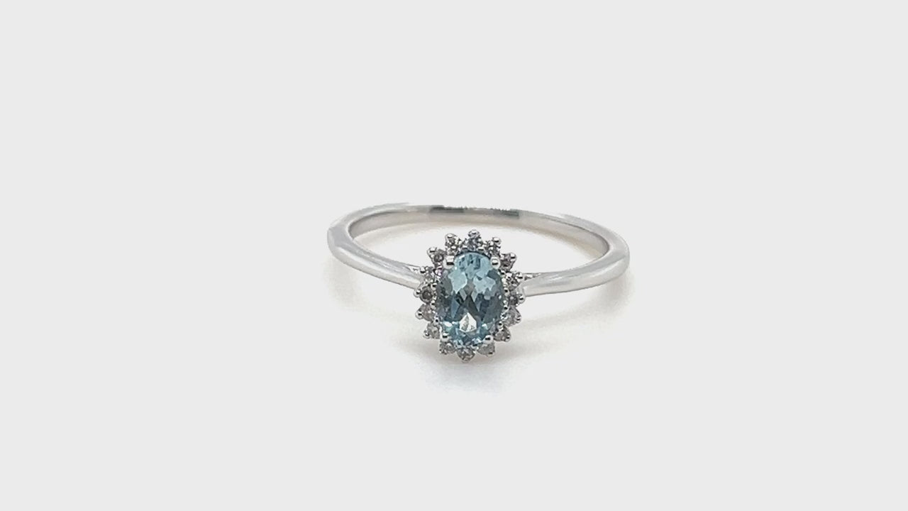 ¡Este anillo es el que debes tener si quieres algo elegante y bonito! El moderno diseño británico de joyería se combina con la eterna atracción del reluciente oro blanco de 9k en este contemporáneo anillo de aguamarina y diamantes. Este llamativo anillo incluye una aguamarina de talla ovalada que pesa 0,40 quilates, acentuada con un halo de 0,10 quilates de diamantes genuinos de calidad G/SI y un diseño simple y elegante. Debido a que está hecho de oro blanco brillante, este anillo tiene un brillo y un brillo asombrosos.