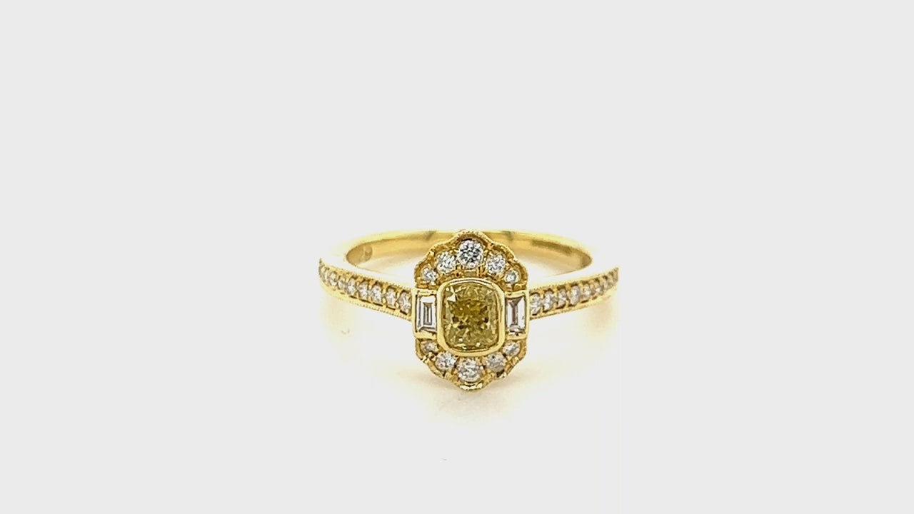 Art Deco Cushion Yellow Diamond 0.65ct Rub Over Ring in 18k Yellow Gold - All Diamond