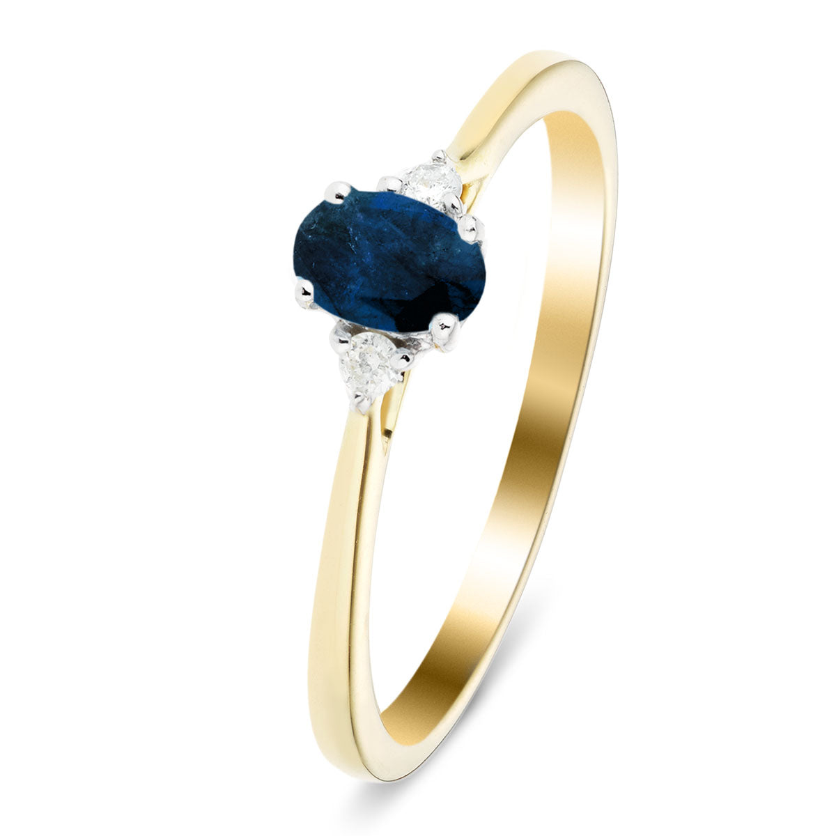 Aquí hay un impresionante anillo de zafiros y diamantes con tres piedras brillantes. El zafiro azul ovalado de 0,60 quilates ha sido tallado y pulido por expertos. Dos diamantes genuinos de calidad G/SI pesan un total de 0,06 quilates y complementan el brillo del zafiro. La banda de este anillo está hecha de oro amarillo de 9 quilates y tiene el sello del Reino Unido. ¡Querrás conservar y lucir este anillo en todos tus eventos especiales!