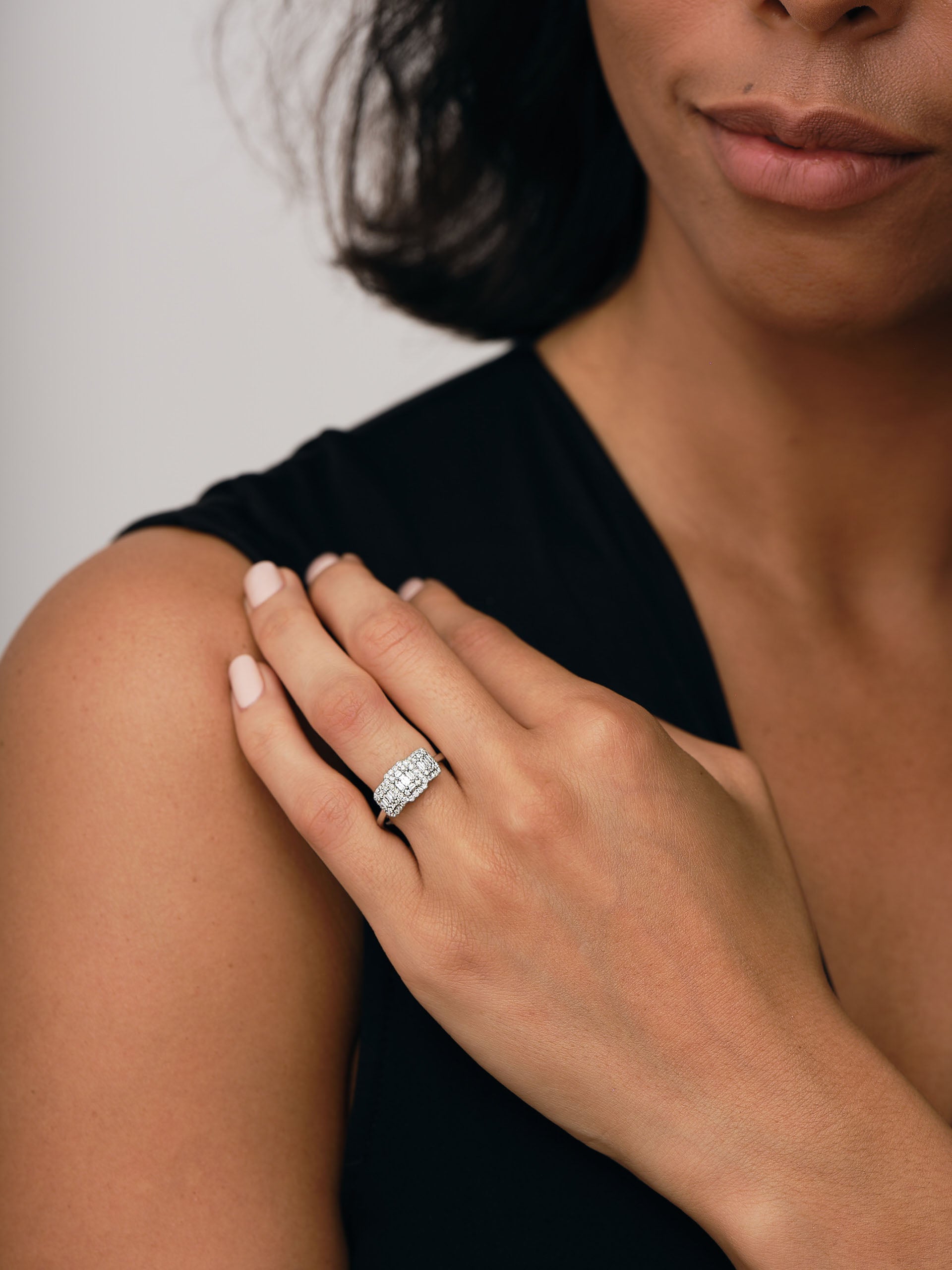 Ella es especial, ¿por qué no darle un anillo especial? Preferiblemente uno con diamantes y oro. Esta pieza es un grupo de 0,45 quilates de diamantes de grado G/SI engastados en oro blanco de 9 quilates con sello del Reino Unido que seguramente llamará su atención. Hecho a mano en el Reino Unido con una impresionante combinación de diamantes de talla redonda y talla baguette, este anillo hará que se destaque por todos los motivos correctos. Y cuando lo deslice en su dedo, sabrá que hablas en serio acerca de estar juntos para siempre.