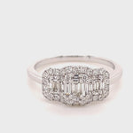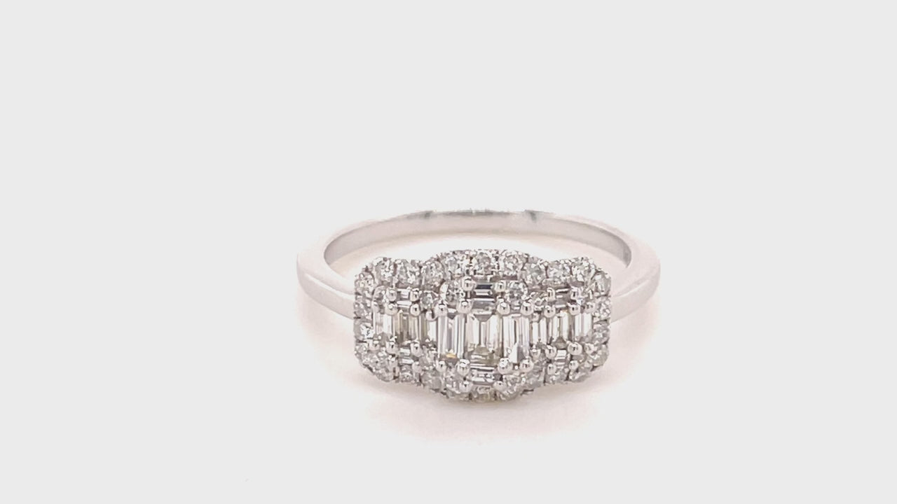 Este anillo de compromiso de diamantes en racimo es fascinantemente hermoso y está exquisitamente elaborado por expertos artesanos utilizando oro blanco de 9k con sello del Reino Unido. Diseñado de una manera única, este anillo de compromiso seguramente llamará la atención dondequiera que vaya. El diseño artesanal presenta 0,70 quilates de diamantes de grado G/SI. La combinación de diamantes de talla baguette y redonda le da un encanto adicional a esta pieza y la hace lucir más elegante que nunca. Regale este impresionante anillo de diamantes en racimo a su ser querido como muestra de su verdadero afecto mutuo.