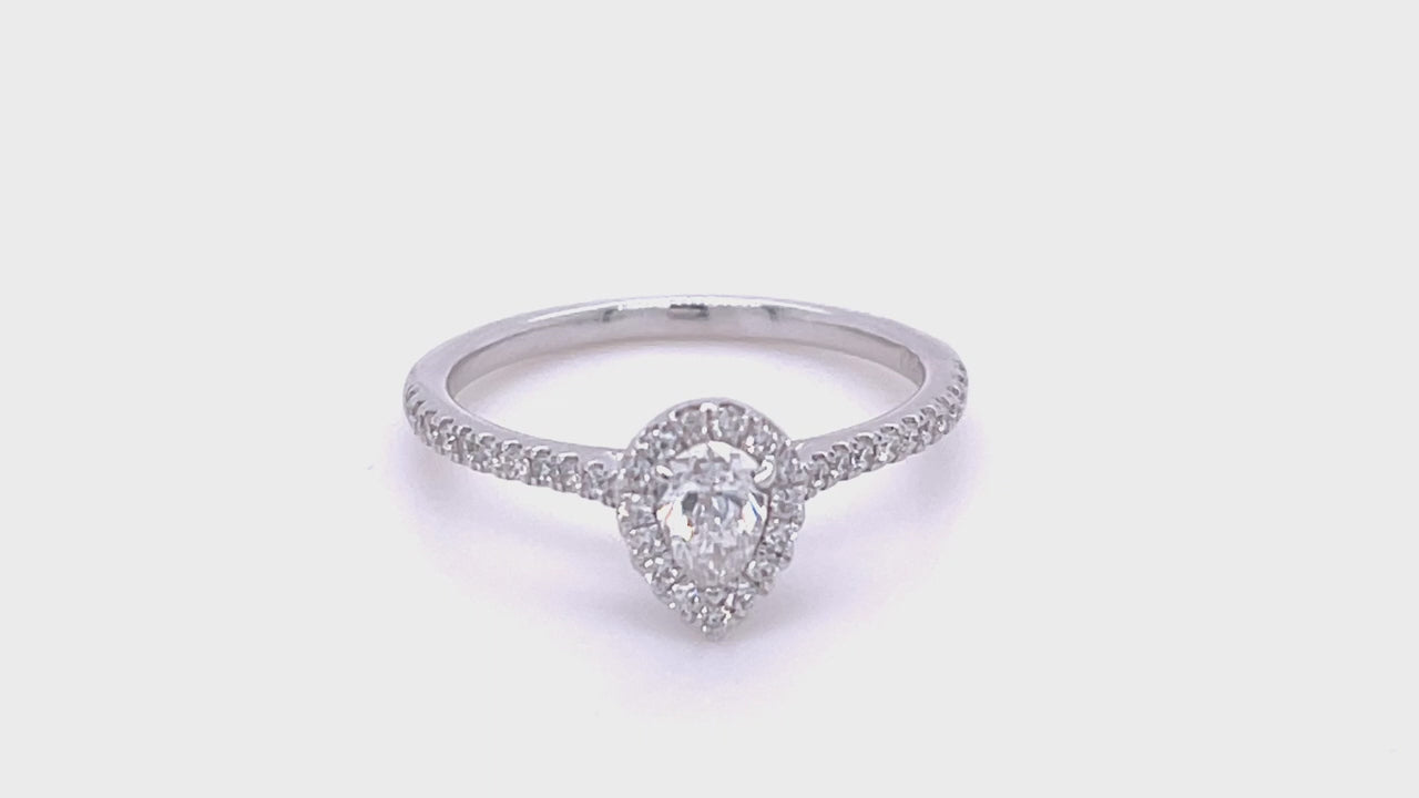 Un brillante diamante blanco en forma de pera se encuentra en el centro de este hermoso anillo de compromiso de diamantes. El diamante de grado G/SI de 0,25 quilates está rodeado por un halo de diamantes cuerpo a cuerpo con más a los lados de la banda de oro blanco de 18k. Los diamantes cuerpo a cuerpo, todos de calidad G/SI, pesan un total de 0,25 quilates para un peso total de diamantes de 0,50 quilates. Nuestros artesanos han utilizado oro blanco de 18 quilates con sello del Reino Unido para la elegante banda que, junto con los diamantes, constituye una magnífica variante del clásico anillo de compromiso de diamantes.