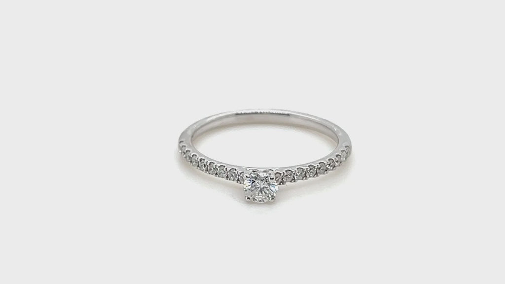 Trate a su pareja como una reina con este impresionante anillo. ¡Proponga matrimonio con este magnífico anillo de compromiso con piedras laterales y observe cómo se iluminan los ojos de su pareja cuando lo vea! El centro de peso total de 0,50 quilates y las piedras laterales están engastados en una banda de oro blanco de 18 quilates con el sello del Reino Unido, lo que le da al anillo un aspecto atemporal. Todos los diamantes son de origen ético y de calidad G/SI. Proporcionamos un informe de clasificación de diamantes individual y una garantía de mano de obra de por vida con este anillo.