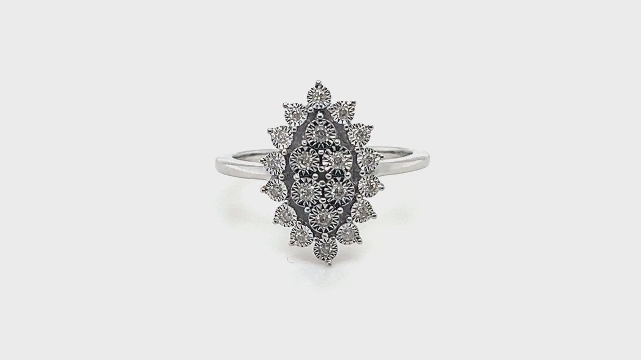 Este es un encantador anillo con forma de marquesa engastado con 0,20 quilates de diamantes de calidad G/SI en un hermoso engaste ilusión. El engaste da la impresión visual de diamantes mucho más grandes debido a cómo el engaste se mezcla con los diamantes y refleja la luz de la piedra preciosa. El anillo está hecho de oro blanco de 9 quilates con sello del Reino Unido. ¡Este es un anillo para elegir para cualquier persona a la que le guste hacer un espectáculo! Al igual que con todas nuestras joyas, este anillo se ofrece con nuestra garantía de mano de obra de por vida.