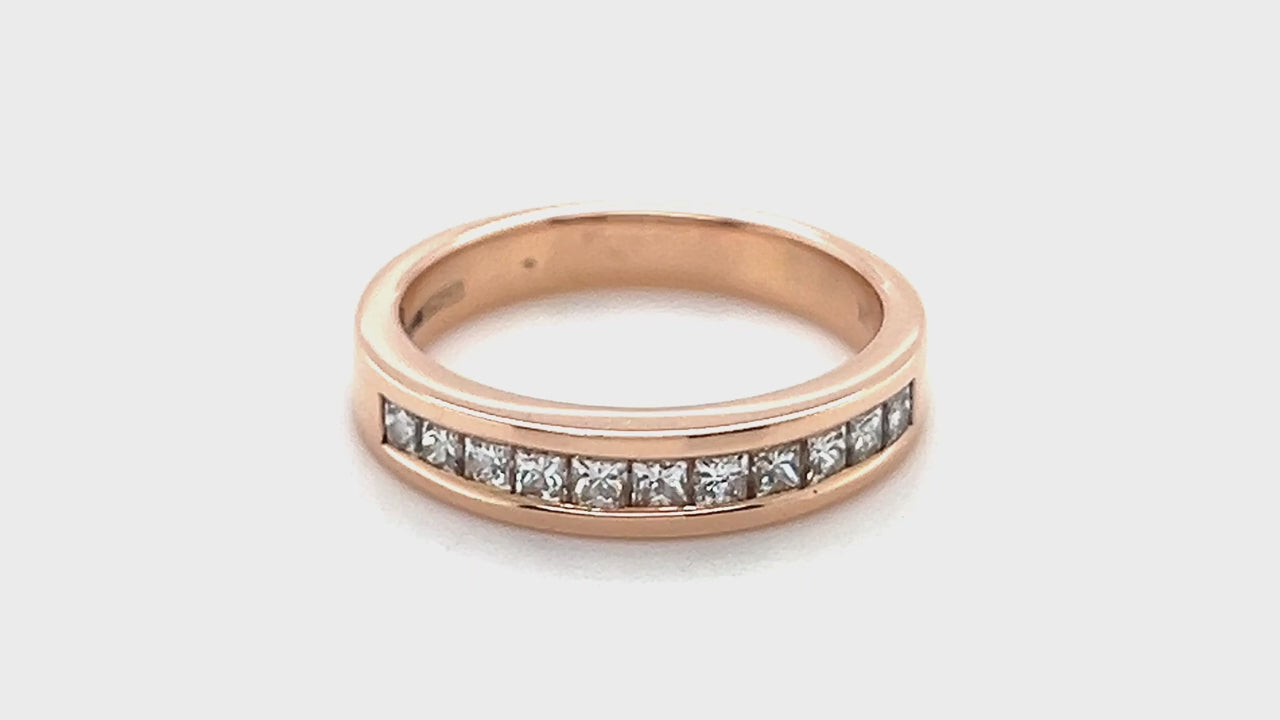 Este encantador anillo de diamantes de media eternidad que contiene medio quilate de diamantes de calidad G/SI cortados a mano con forma de princesa está realzado con una cálida banda de oro rosado de 18k de 3,8 mm de ancho. Hecha a mano con cuidado en el Reino Unido, esta pieza es una muestra de amor genuinamente encantadora que será un regalo conmovedor para cualquier ocasión especial.