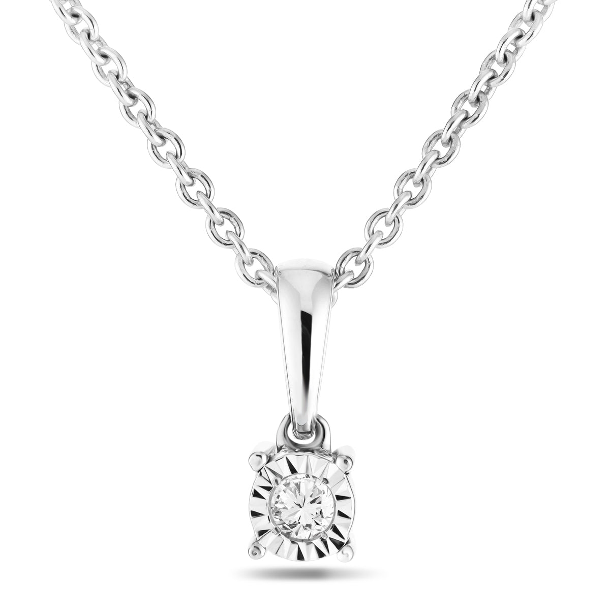 Cuidadosamente diseñado con un engaste de ilusión brillante, este colgante de diamante solitario de 0,04 quilates parece mucho más grande de lo que sugeriría el peso en quilates del diamante. Nuestros diseñadores han hecho maravillas para hacer que el diamante luzca mucho más grande de lo que sugiere su peso en quilates. El diamante es de calidad G/SI por su gran color, brillo y destello, y está engarzado en oro blanco de 9 quilates con el sello del Reino Unido. Ofrecemos este encantador collar con solitario de diamantes con una garantía de mano de obra de por vida.