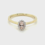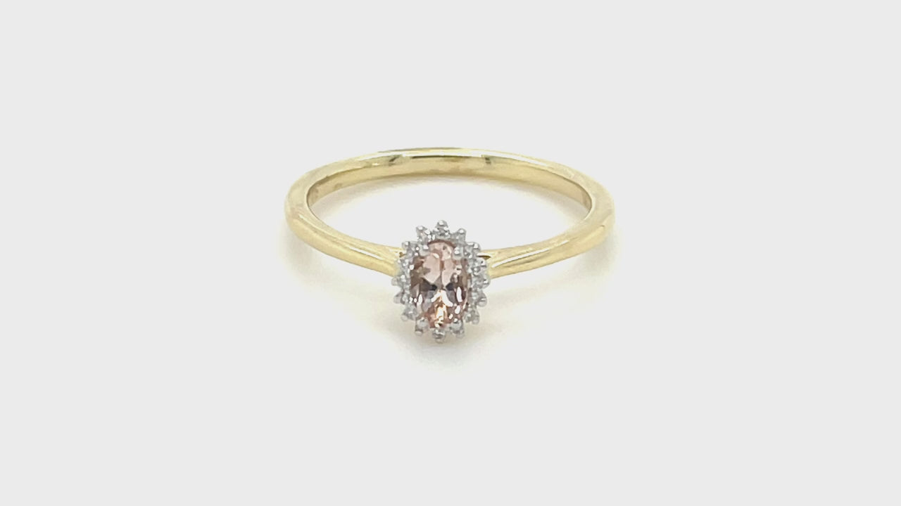 Este anillo con halo, con su pieza central de morganita y su hermoso halo de diamantes, es adecuado para cualquier evento y guardarropa. La morganita de talla ovalada de 0,25 quilates está acentuada por 0,05 quilates de diamantes de calidad G/SI engastados en un halo brillante alrededor de la piedra central, lo que resalta los suaves tonos rosados ​​del interior de la piedra. El oro amarillo de 9 quilates que sostiene las hermosas piedras ha sido contrastado en el Reino Unido. ¡Este hermoso anillo fue hecho para que lo disfrutes!