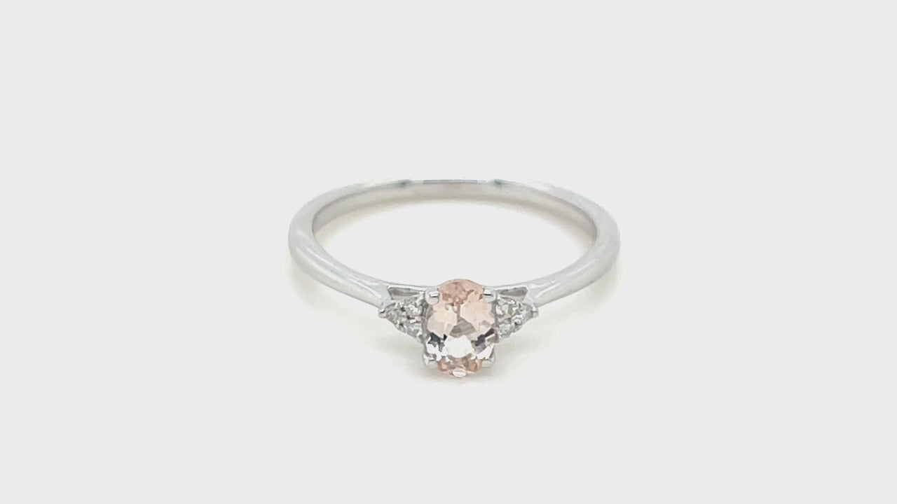 Este es un anillo en racimo de morganita y diamantes que es ideal para usar con cualquier atuendo y en cualquier ocasión. Los delicados tonos rosados ​​de la morganita de talla ovalada de 0/35 quilates se acentúan con los diamantes de calidad G/SI de 0,04 quilates engarzados en racimo en los costados de la piedra central. Nuestros diseñadores han utilizado oro blanco de 9 quilates con sello del Reino Unido como telón de fondo para las preciosas piedras preciosas. ¡Te encantará lucir este hermoso anillo!