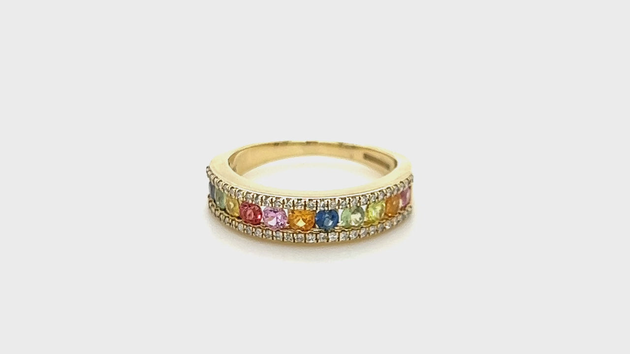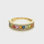 Este es el anillo de la eternidad que buscas cuando buscas algo que se destaque del resto. Este colorido anillo de eternidad de zafiros y diamantes presenta una hermosa variedad de zafiros en colores vibrantes acentuados con dos filas de diamantes de calidad G/SI. Los diamantes pesan un total de 0,25 quilates y los zafiros tienen un peso combinado de 0,90 quilates, todos engastados en una banda de oro amarillo de 9k.