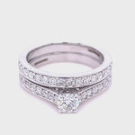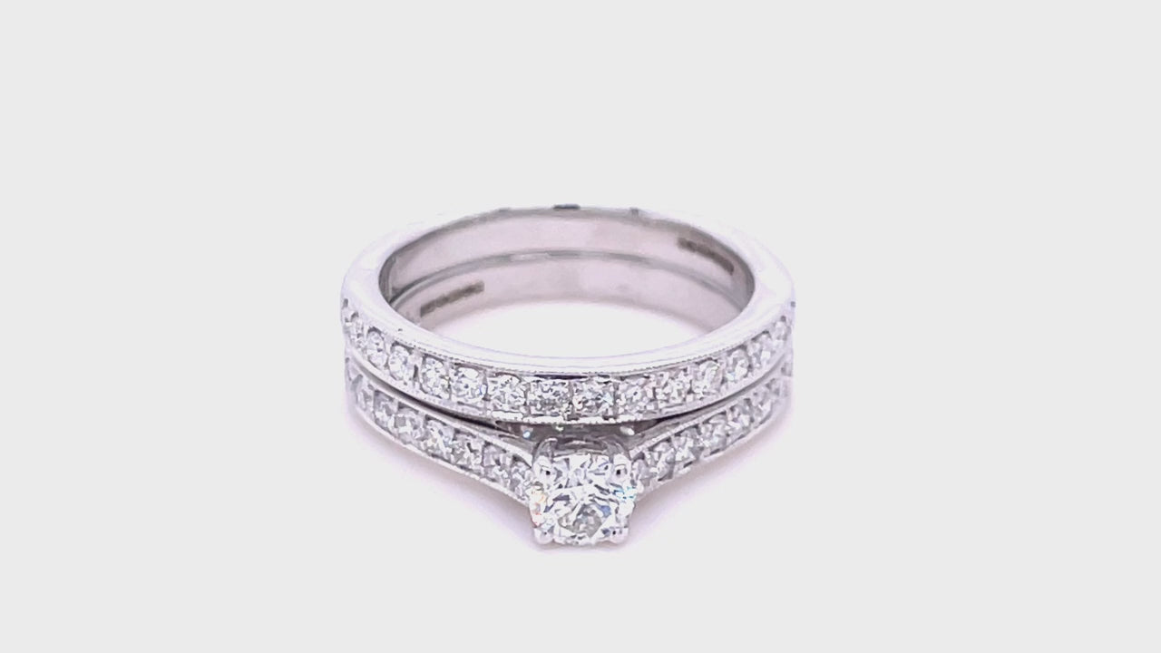Sabemos que quieres que todo en tu día especial sea perfecto. Asegúrese de que los anillos a juego sean algo menos de lo que preocuparse con este hermoso conjunto nupcial en oro blanco brillante de 18k con el brillo de 0,90 quilates de diamantes cortados a mano y de origen ético. Nuestros artesanos británicos combinaron a la perfección el anillo de boda y de compromiso para darle una belleza atemporal para el resto de sus vidas juntos.