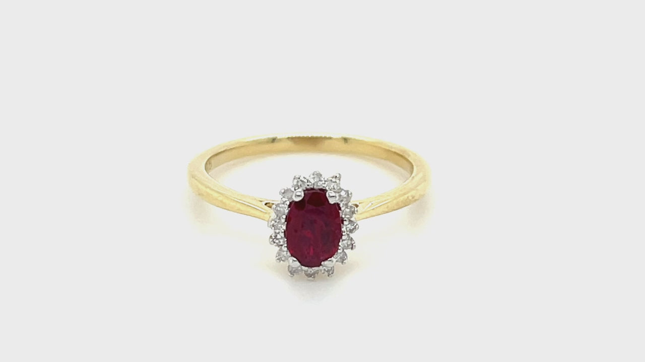Nuestros diseñadores combinaron un rubí rojo sangre con brillantes diamantes naturales blancos para crear este magnífico anillo de rubí y halo de diamantes. La banda de oro amarillo de 9k tiene el sello del Reino Unido. El anillo tiene un rubí rojo de talla ovalada de 0,50 quilates. Para resaltar la piedra central, se utiliza un halo de diamante blanco de calidad G/SI con un total de 0,10 quilates para crear un brillo que acentúe el rojo intenso del rubí. Si te sientes apasionado o romántico, debes usar este anillo.