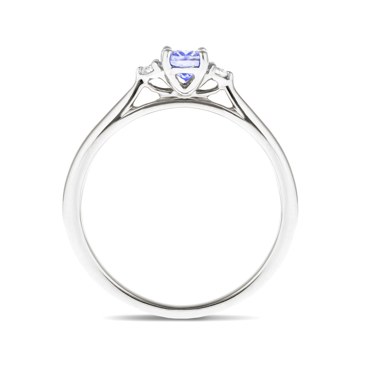 Hermoso a la vista es este anillo de tres piedras de tanzanita y diamantes. La tanzanita de este anillo es de 0,50 quilates y ha sido tallada en forma ovalada. Un par de diamantes de calidad G/SI está engastado a ambos lados de la piedra central azul/violeta, lo que resalta su brillo. El peso total en quilates de los diamantes naturales es de 0,06. La banda del anillo es de oro blanco de 9 quilates que ha sido contrastada en el Reino Unido. El anillo viene con una garantía de por vida en la artesanía.